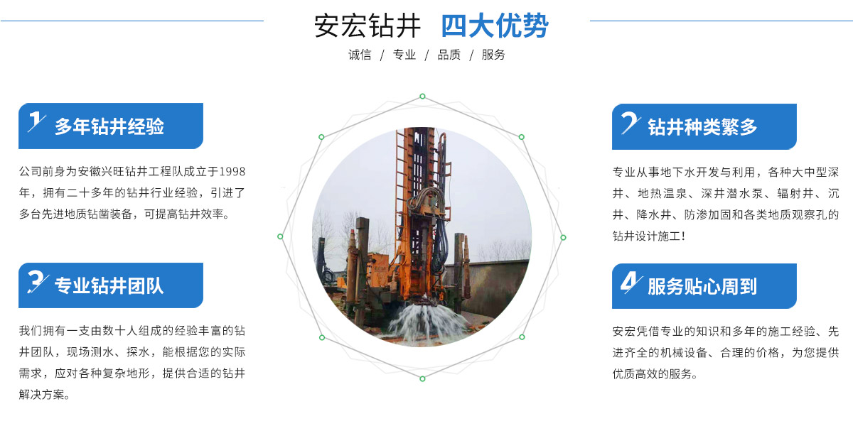 - 寧國市安宏鉆井工程有限公司,前為安徽興旺鉆井工程隊成立于1998年,公司從事安徽鉆井(宣城打井、寧國打井、蕪湖打井、池州打井、宿州打井、桐城打井、銅陵打井、南陵打井、郎溪打井、廣德打井、績溪打井、馬鞍山打井等),江蘇鉆井(南京打井、高淳打井...